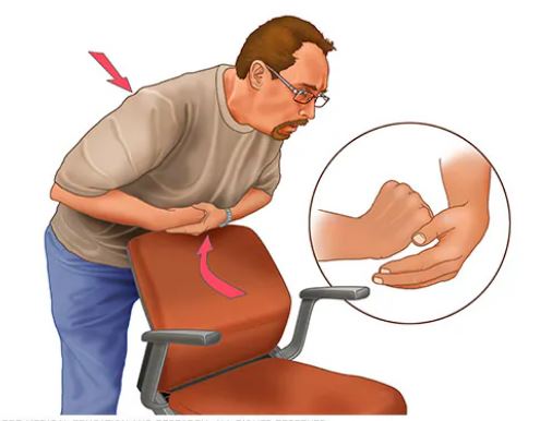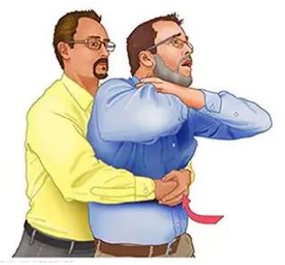 - Press into the stomach with a quick, upward thrust 5 times — as if trying to lift the person up.