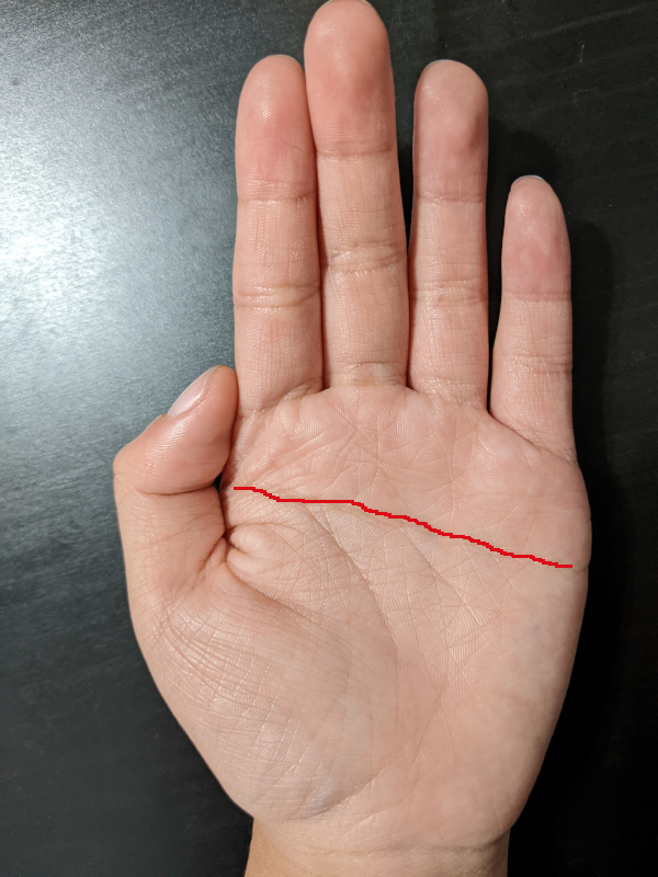 Vị trí: Một đường duy nhất chạy ngang qua lòng bàn tay, thay thế cho cả đường trí đạo và đường tâm đạo.